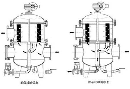 RZFG型全自動濾水器由執(zhí)行機構(gòu)及自動控制機構(gòu)組成,執(zhí)行機構(gòu)由電動減速裝置、濾水器本體、電動排污閥等組成。自動控制機構(gòu)由安裝在濾水器本體上的差壓控制器及PLC、模塊、電器控制箱組成。