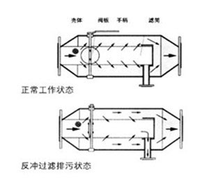 手 動蝶閥關閉,即閥板平面與筒體軸線垂直,(此時扳手旋轉90度與筒體軸線垂直),開啟排污閥,此時水流從進口進入過濾網(wǎng)筒前端,因蝶閥關閉,水流被閥板擋住,只能從前端網(wǎng)孔進入濾筒外側,大部分從出口流出,而由于排污口打開,濾筒后段水排出后壓力降低,故一部分水又從過濾器后段的網(wǎng)孔反沖入網(wǎng)筒內(nèi),從而達 到從濾網(wǎng)外部沖洗粘附在網(wǎng)筒內(nèi)壁上雜質(zhì)的目的,雜質(zhì)及污水從排污口排出。